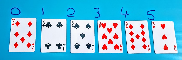 In the array of cards below , if you searched for the item ‘4 of clubs’, the algorithm would return the integer 1.